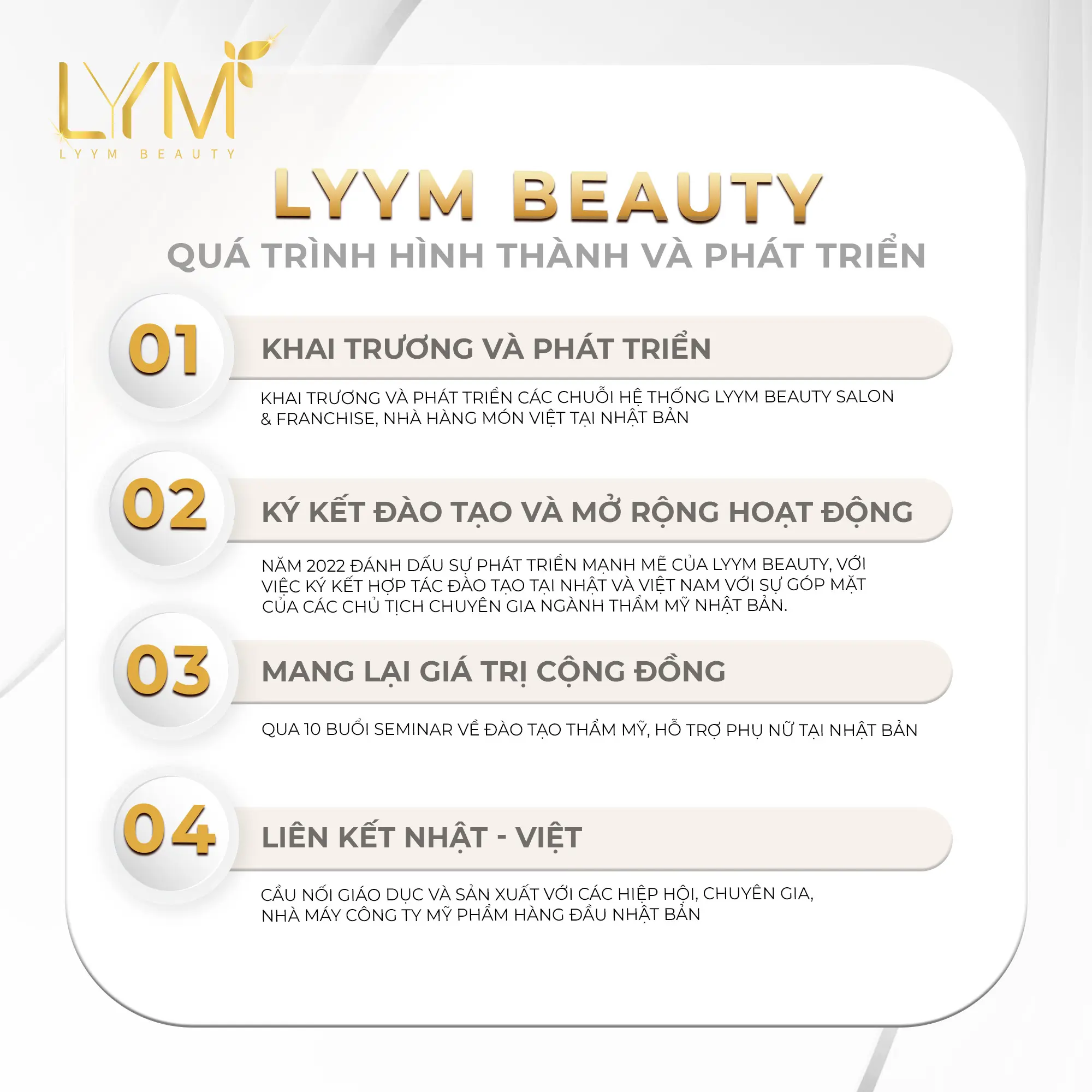 Bridging Vietnam with Japan and the World LYYM Beauty is not just a beauty company but also a bridge connecting Vietnam with Japan and the world. We are always proud of LYYM’s mission, and our team is consistently striving to create a solid platform for cultural, economic, and educational exchange. LYYM Beauty always looks towards the future, walks alongside women, opens new development opportunities, and becomes an inspiration helping women chase their dreams, unite and create beautiful values contributing to society.